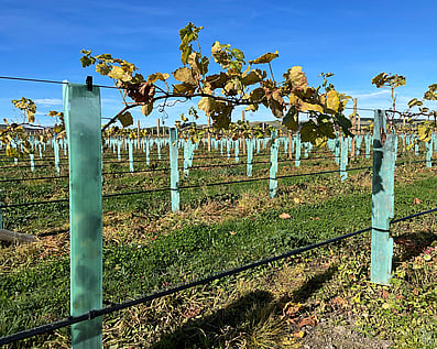 We're keeping a photo diary of our third Pinot Gris block being developed. The trellis and the irrigation was installed in the winter months of 2022. Vines were planted in October and since then they've put on a lot of growth. As the nights cool down they are shutting down for the winter.